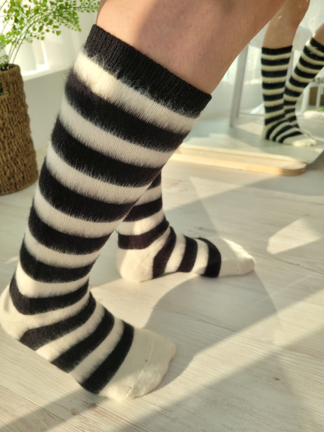 <여성 중목 기모 양말-블랙&아이보리 줄무늬 조합>